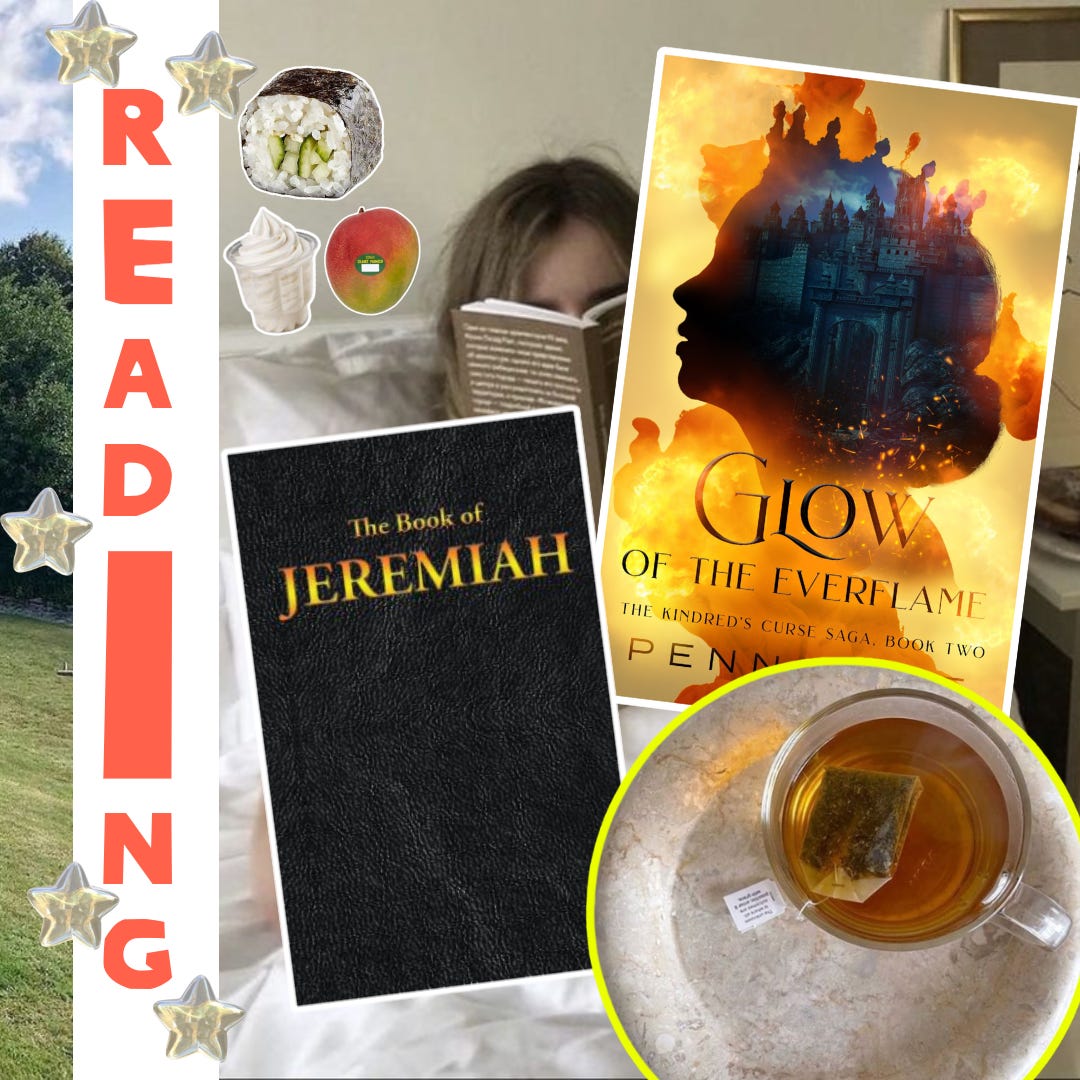 The book of Jeremiah is my current Bible read, and I JUST finished the Everflame series by Penn Cole and 😠I 😠want 😠to 😠go 😠backkkkkk. Oh my Jesus. She did a phenomenal job. Way better than ACOTAR in my opinion.